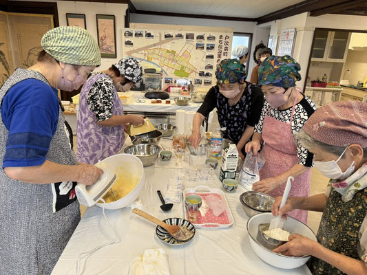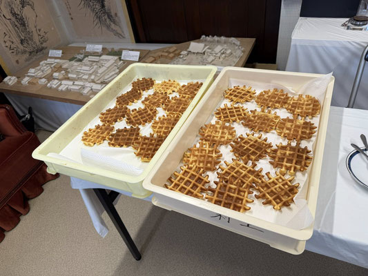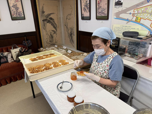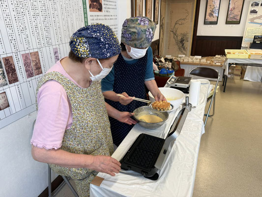 よいやかがり火に向けて、杏の会がワッフル作りをしています!丁寧に一つずつ手作りしています